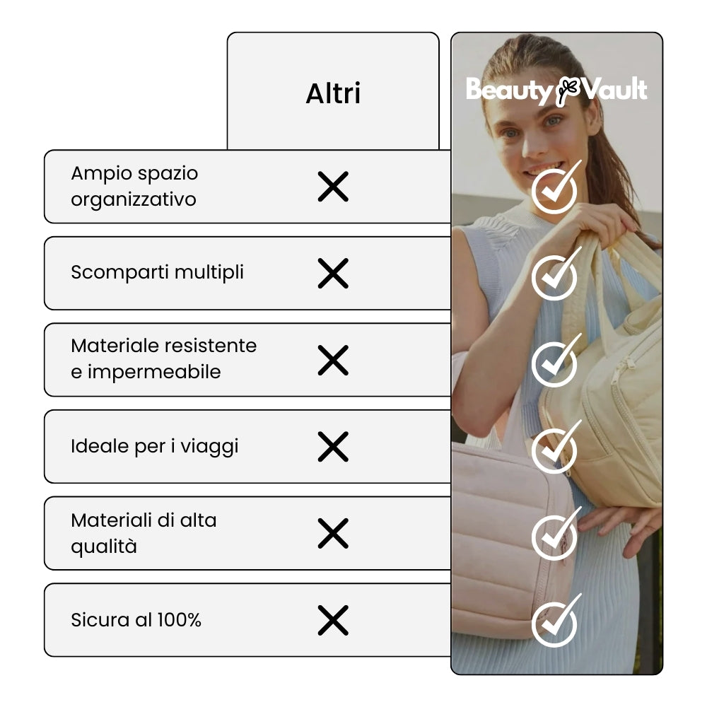 “Finalmente una borsa che tiene tutti i miei trucchi organizzati. Gli scomparti separati mi permettono di trovare subito ogni prodotto, senza più perdere tempo!”
